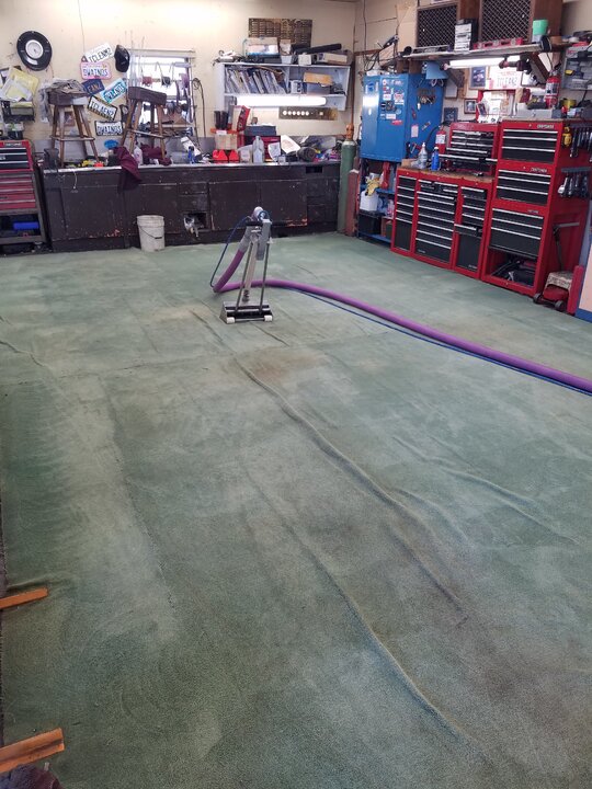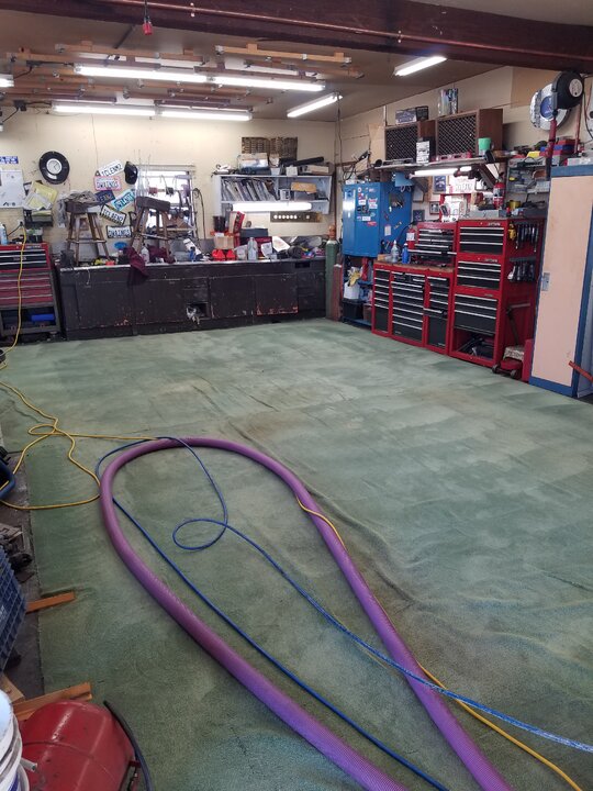 My shop carpet at one time was installed in a moderate to high end motel. They were replacing all there rooms carpet i offered to haul away 5 rooms worth if they left them whole and cut them square i had um then cut to fit and seamed together so when i drove on them they wouldn't split apart and would lay relatively flat. This carpet is the second one in 37 years thats been in this shop. And was destined for the dumpster when i got it a couple of decades ago. Ive held off cleaning this time it because im activity looking for a replacement. I may even go new this time, that way ill only have 2 seams. 1 long 12'× 32' piece across the back with a 12' × 14' down each of the 2 bays so id need only 60' off a 12' wide roll each bay will still be carpeted 14×24. I do all my own maintenance and repair on equipment and vehicles. I dont own a creeper cus its like changing oil in my livingroom. There's times i turn up the heat, kick off my shoes and wench. Only problem doing repair on wall to wall carpet is if you drop a tiny part you can't hear which way it rolled. Ive convinced several dyr's if there doing maintenance in there garage or driveway to go dumpster diving at a local carpet store and get a piece of carpet to work on and when it gets too dirty toss it and pickup another