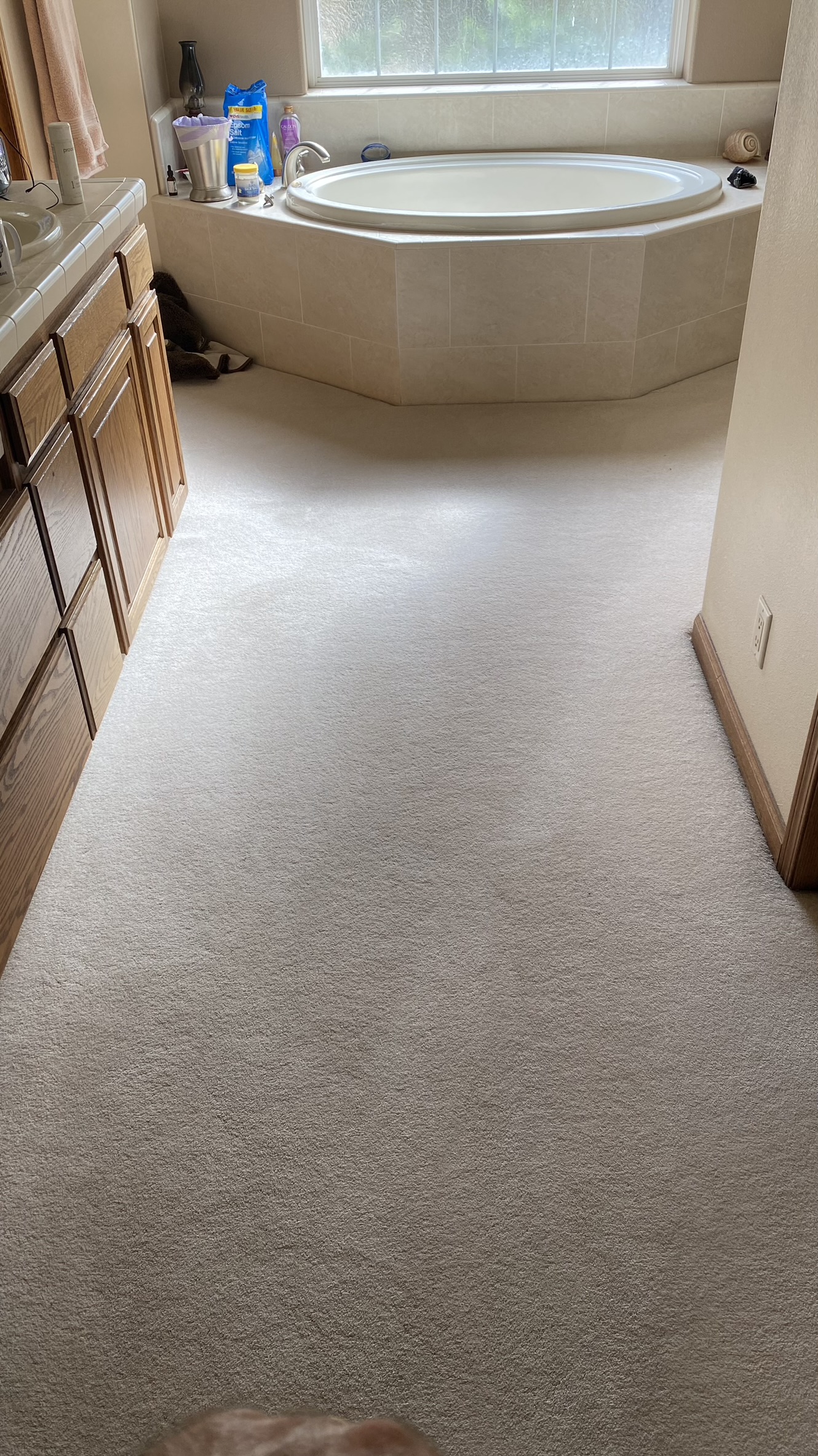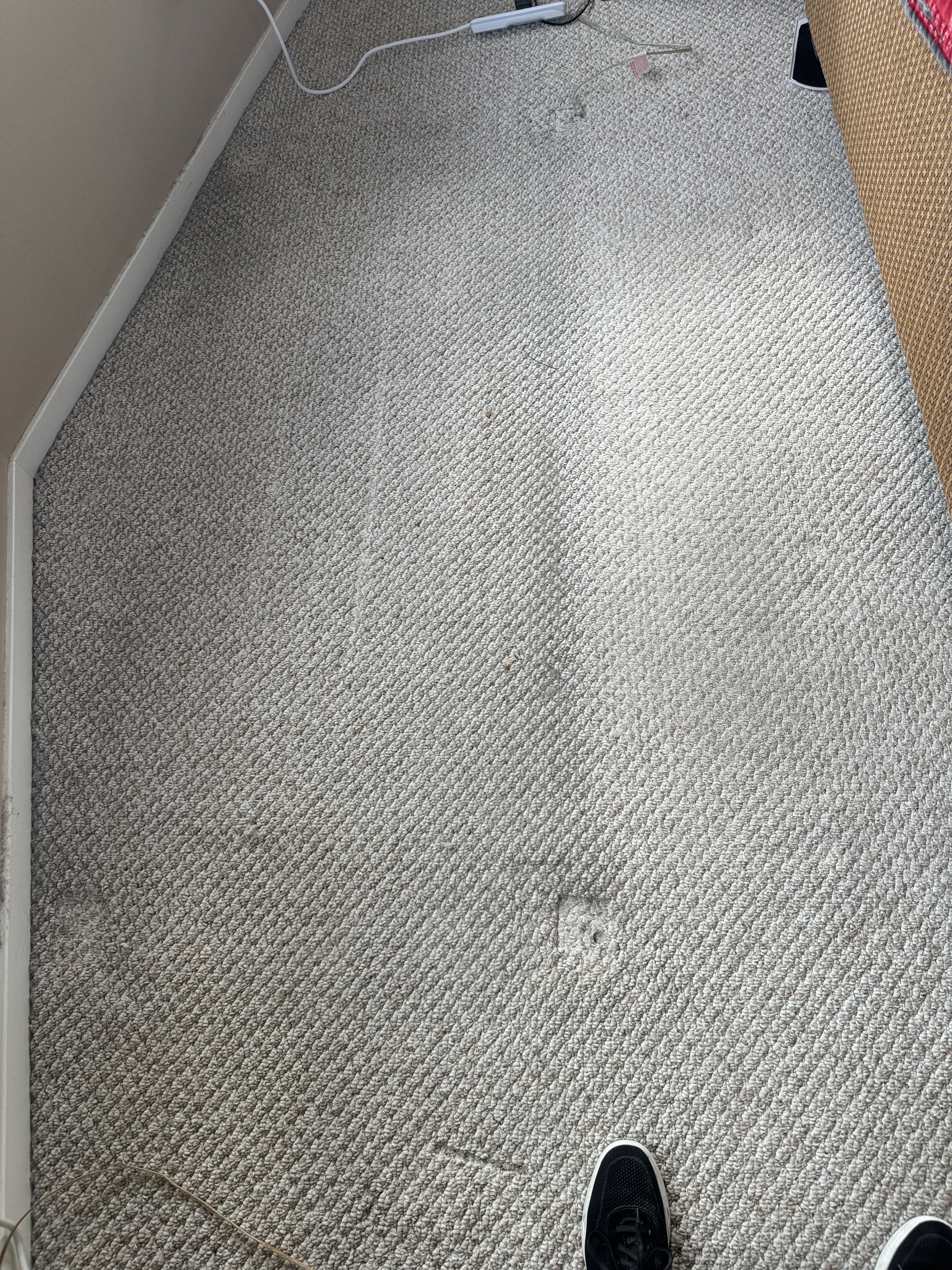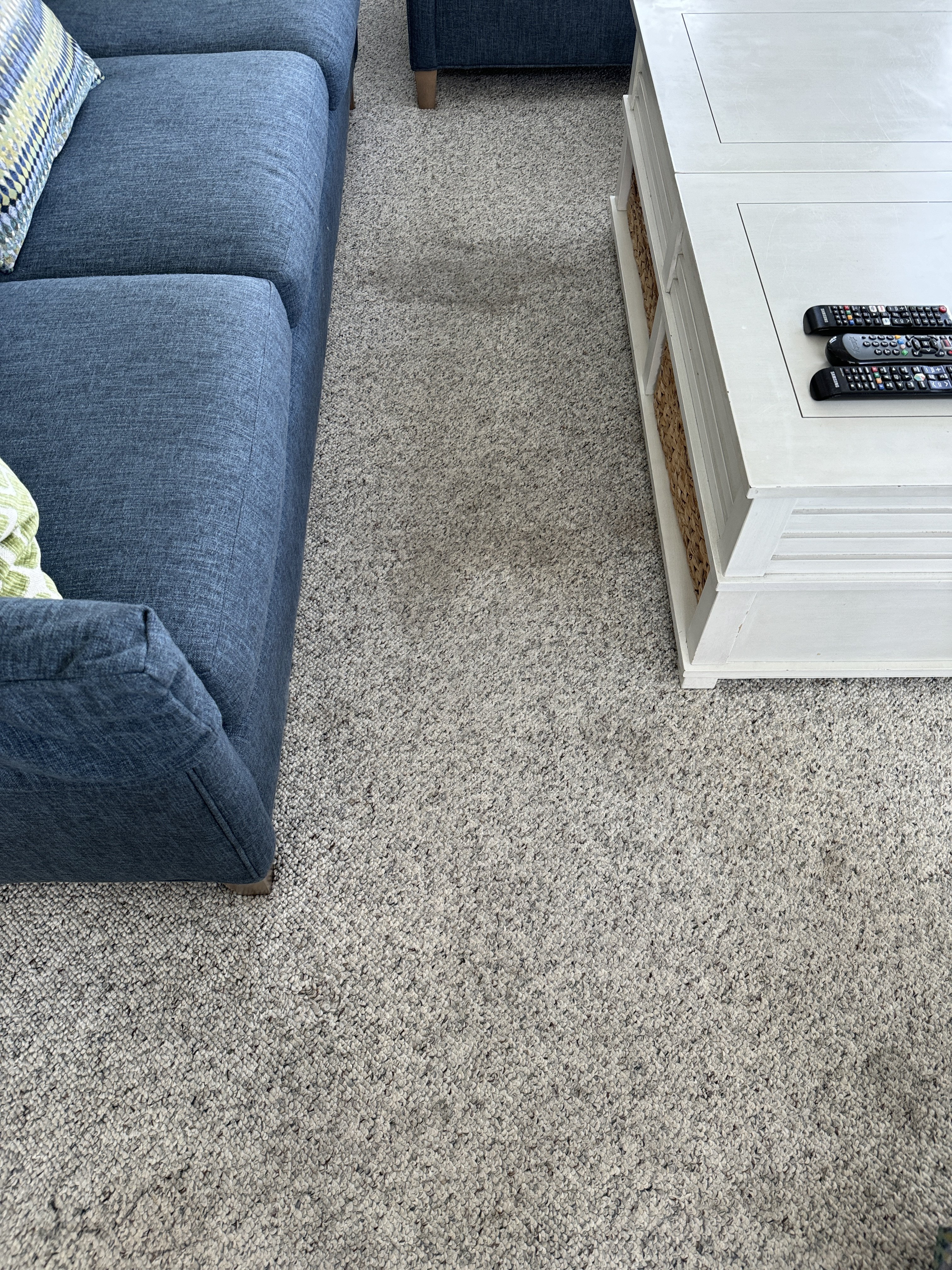 Last week I cleaned 2400 sqft of older white carpet in a very large house on a private ranch. The customer had many dogs that were doing dog things on the carpet. The customer had only cleaned the carpet himself over the years with a Bissell. The carpet was awful and full of dirt and neglect. It was filled with so much soap residue it was killing my suck. After working for an eternity on the place, I get a call from the customer about 2 hours after I left about stains wicking up. There was a trail in the living room carpet where the customer poured dish soap in attempt to clean the carpet himself. No matter what I told him before about his animals and wicking, it just went in one ear and out the other. As a courtesy I agreed to go back today and take care of the stains.