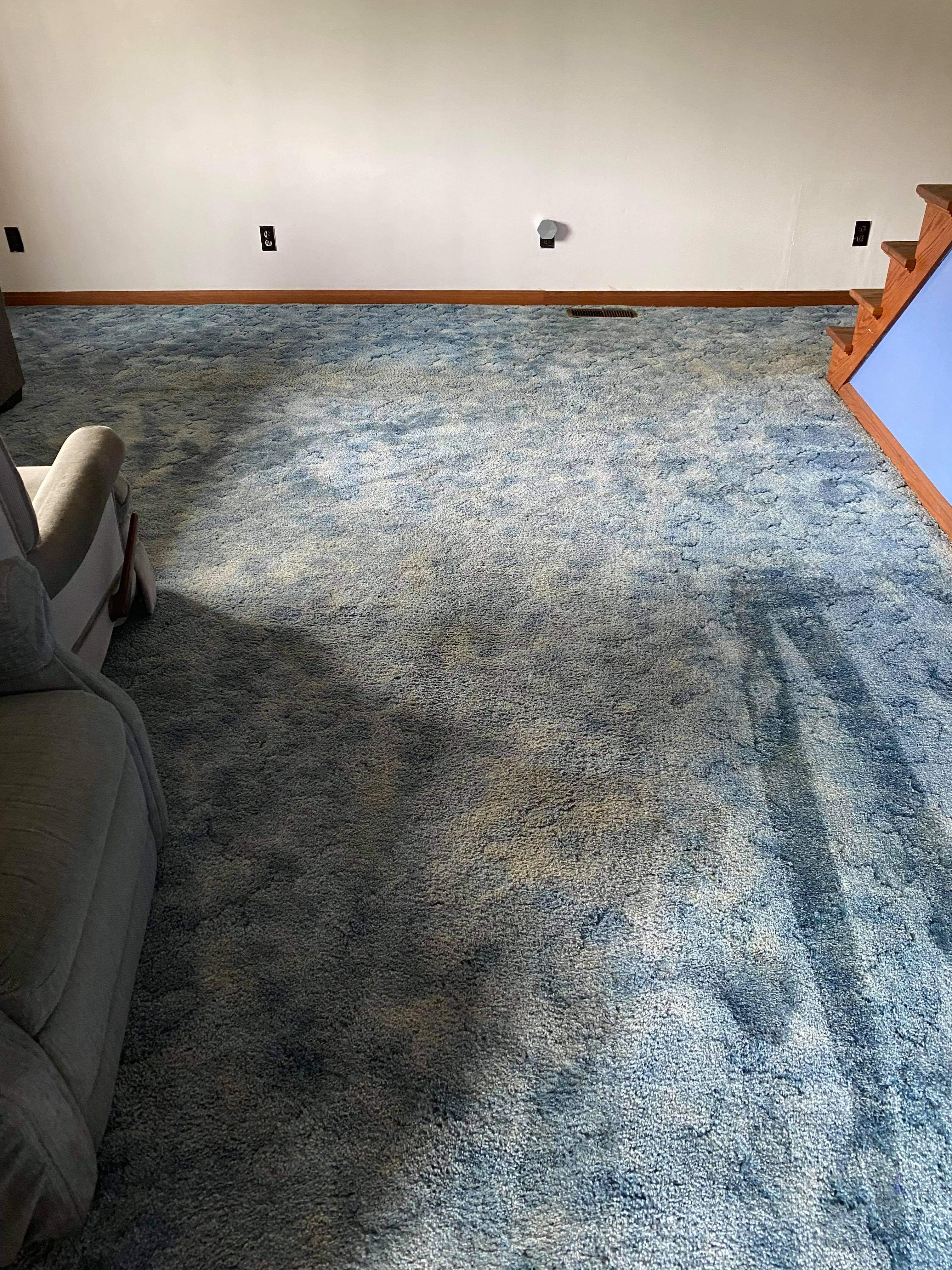 I get there and it’s old blue carpet that’s brown in the traffic lanes. The tech’s before picture shows it was a lot worse, but he said the brown turned bluer. By the time I got there it was brown again. The client told me she used her home scrubber and it came out better than today’s job and the tech must not have cleaned those rooms. I felt the carpet, just barely damp, so it got cleaned, dry strokes on par. It didn’t look crushed down, it didn’t feel like it had any residue on the fibers, it just looked stained. There are some spots that look darker that I think are coffee or something else and may come out, but the brown I think is damage.