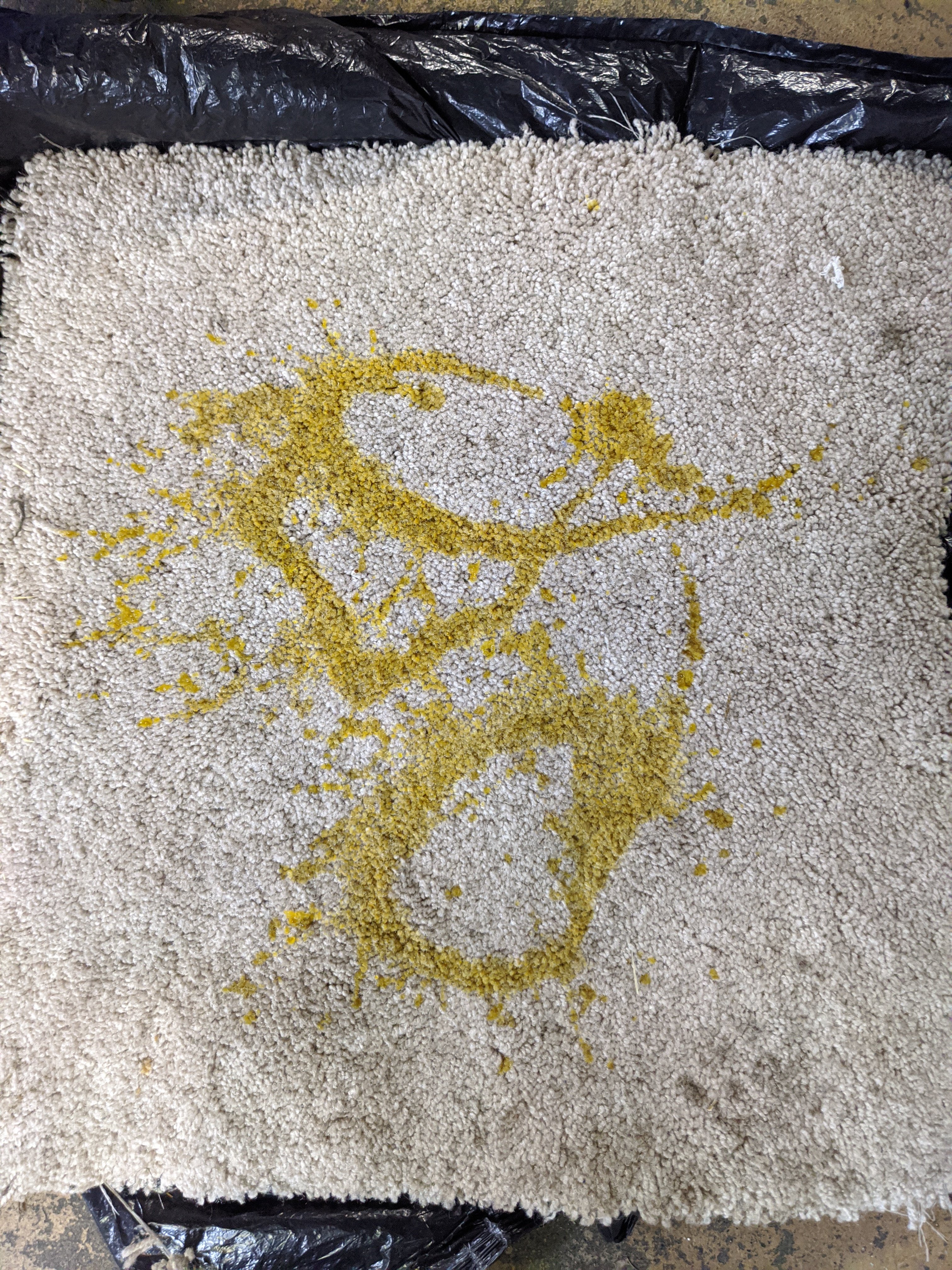 Here is a photo of a carpet sample that I stained today with tumeric and water. Will be practicing my stain removal techniques in preparation for the real thing next week. After rinsing, I will be using a peroxide/ammonia solution (vanish) along with a steamer. Any other suggestions that have achieved good results for you?